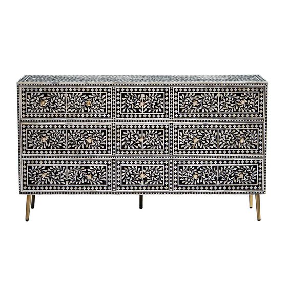 Variations in the natural product color, pattern, and shade are inherent and unique characteristics to be expected with this bone inlay chest of drawers. No two tables are ever exactly alike, with thousands of intricate pieces hand-laid to complete this delightful masterpiece. Each product is unique and may have different variations with anomalies due to handmade in nature.