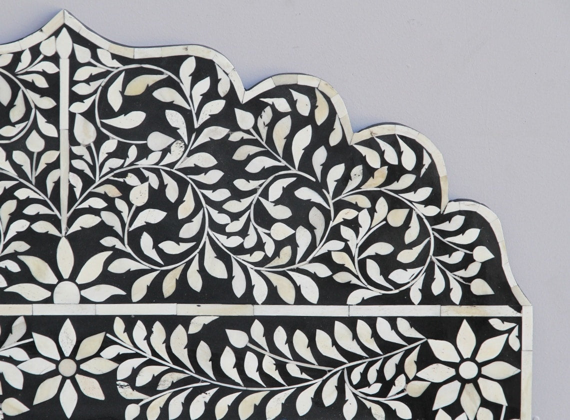 Each piece has been handcrafted in a process that can take weeks using honorably sourced Bone / Mother of Pearl. Delicately carved pieces of Bone/Mother of Pearl have been individually inlaid onto a wooden frame in an elaborate pattern. Layers of colored resin are then used to fill around the bone/mop. Finally, the backside and inside areas are painted with the matching colors.