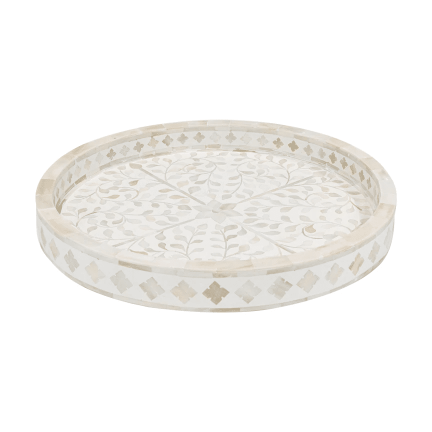 Each piece has been handcrafted in a process that can take weeks using honorably sourced Bone / Mother of Pearl. Delicately carved pieces of Bone/Mother of Pearl have been individually inlaid onto a wooden frame in an elaborate pattern. Layers of colored resin are then used to fill around the bone/mop. Finally, the backside and inside areas are painted with the matching colors.