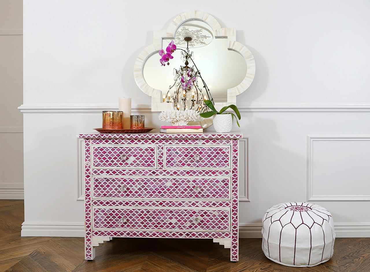 Each piece has been handcrafted in a process that can take weeks using honorably sourced Bone / Mother of Pearl. Delicately carved pieces of Bone/Mother of Pearl have been individually inlaid onto a wooden frame in an elaborate pattern. Layers of colored resin are then used to fill around the bone/mop. Finally, the backside and inside areas are painted with the matching colors.