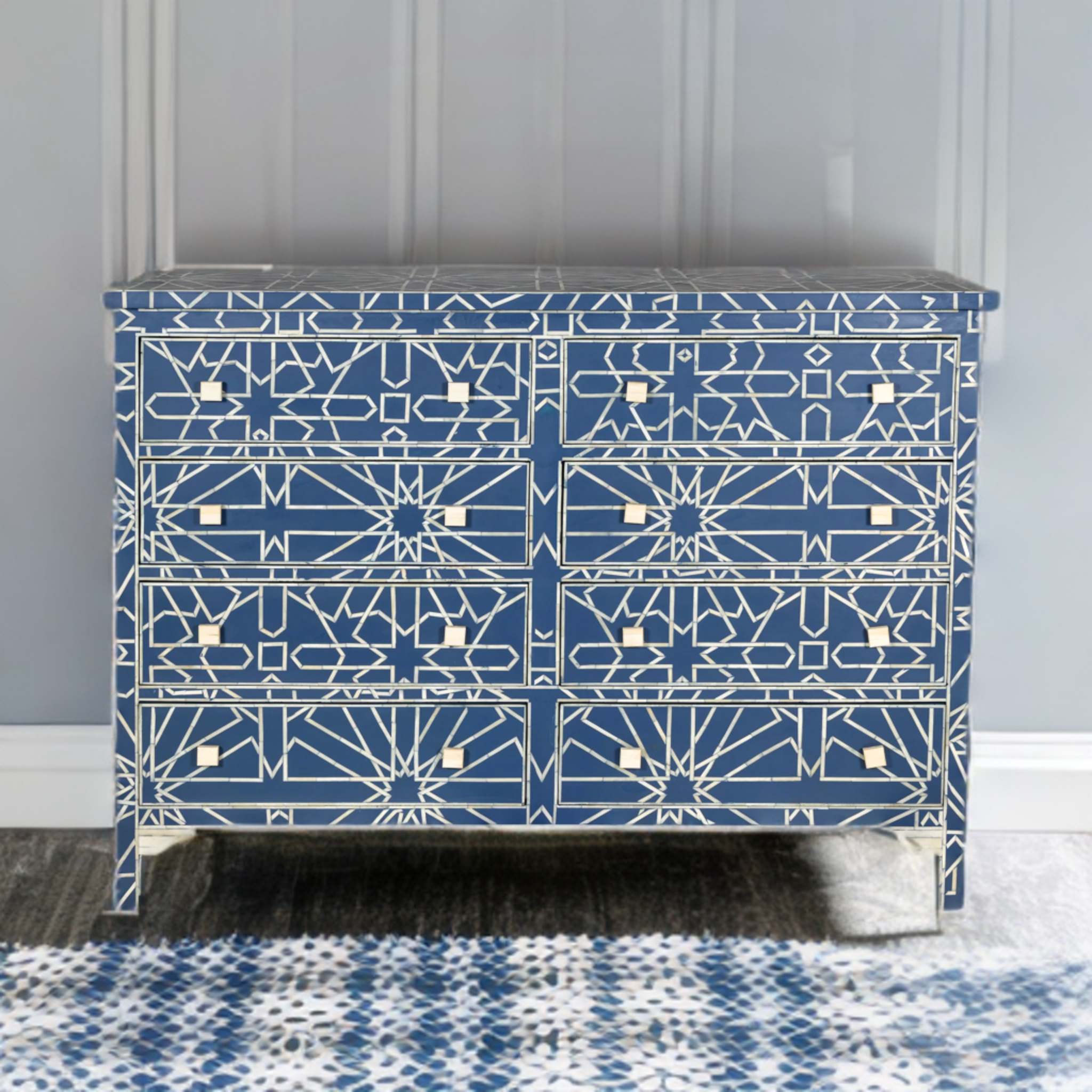 Each piece has been handcrafted in a process that can take weeks using honorably sourced Bone / Mother of Pearl. Delicately carved pieces of Bone/Mother of Pearl have been individually inlaid onto a wooden frame in an elaborate pattern. Layers of colored resin are then used to fill around the bone/mop. Finally, the backside and inside areas are painted with the matching colors.