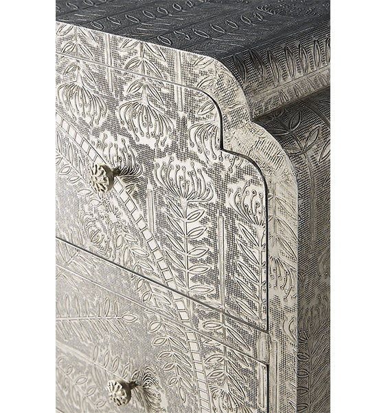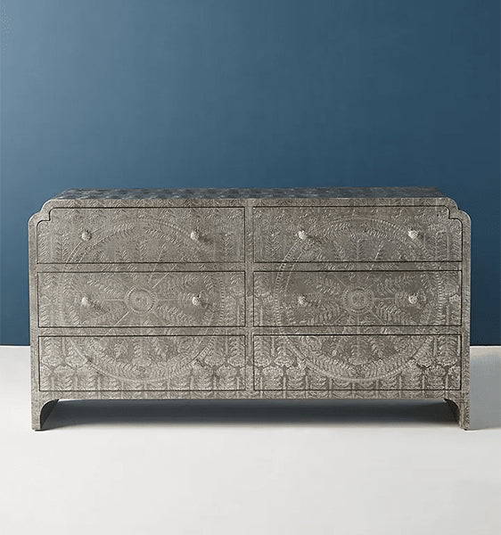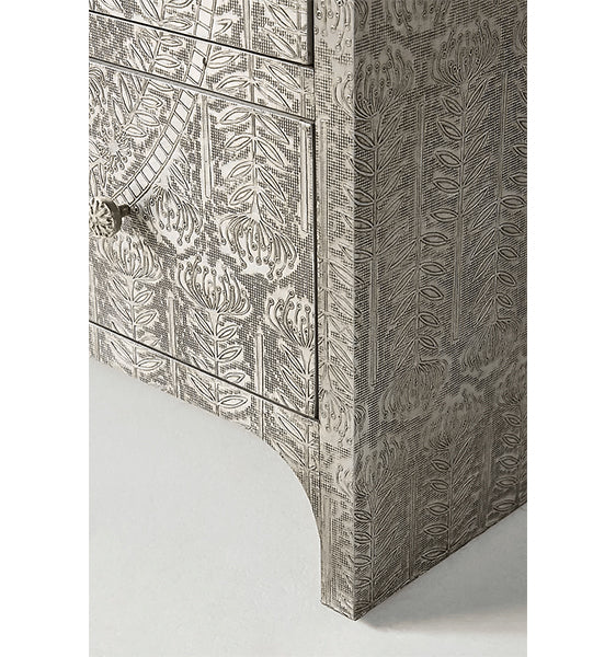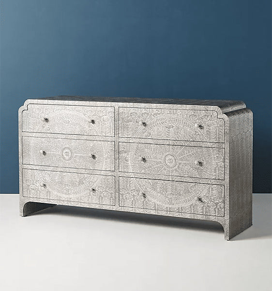 Variations in the natural product color, pattern, and shade are inherent and unique characteristics to be expected with this German Silver Chest of Drawers. No two tables are ever exactly alike, with thousands of intricate pieces hand-laid to complete this delightful masterpiece. Each product is unique and may have different variations with anomalies due to handmade in nature.