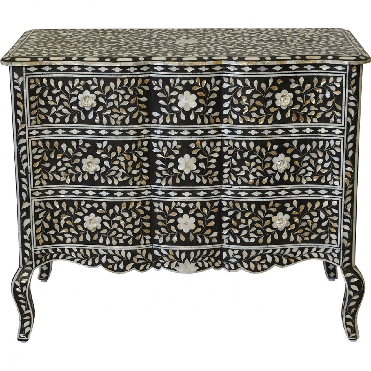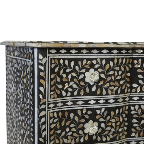 Each piece has been handcrafted in a process that can take weeks using honorably sourced Bone / Mother of Pearl. Delicately carved pieces of Bone/Mother of Pearl have been individually inlaid onto a wooden frame in an elaborate pattern. Layers of colored resin are then used to fill around the bone/mop. Finally, the backside and inside areas are painted with the matching colors.
