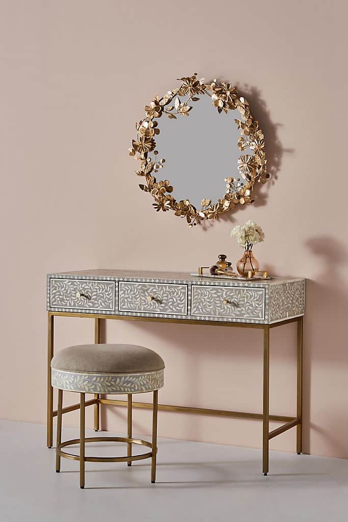 - Dimensions: Vanity table: 42″W x 18″D x 31″H; Stool: 18″ Dia x 21″H