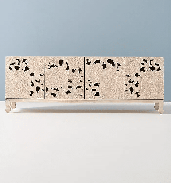 Experience the allure of our meticulously hand carved media cabinet, a versatile piece that effortlessly doubles as a stylish buffet. Its exquisite craftsmanship showcases intricate lotus motifs, while its ample storage space and adjustable shelving provide practical functionality for all your media and dining essentials.