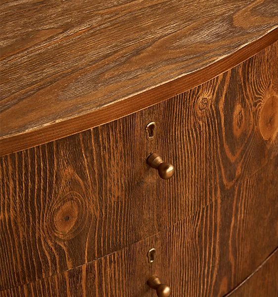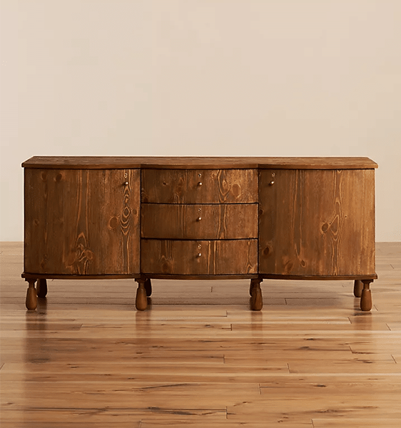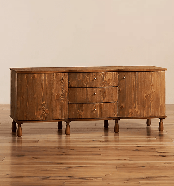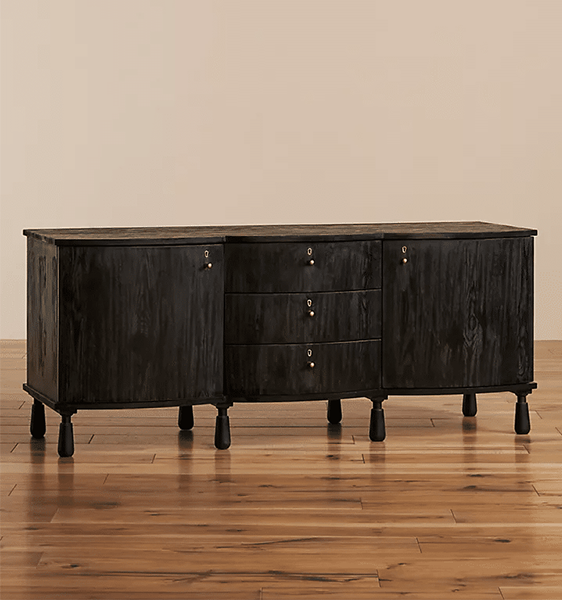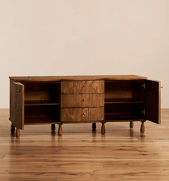 This console exudes a timeless charm with its exquisite appearance. Its captivating design boasts a pair of enclosed compartments, three drawers, and gracefully carved legs, infusing an element of organic beauty into any room.