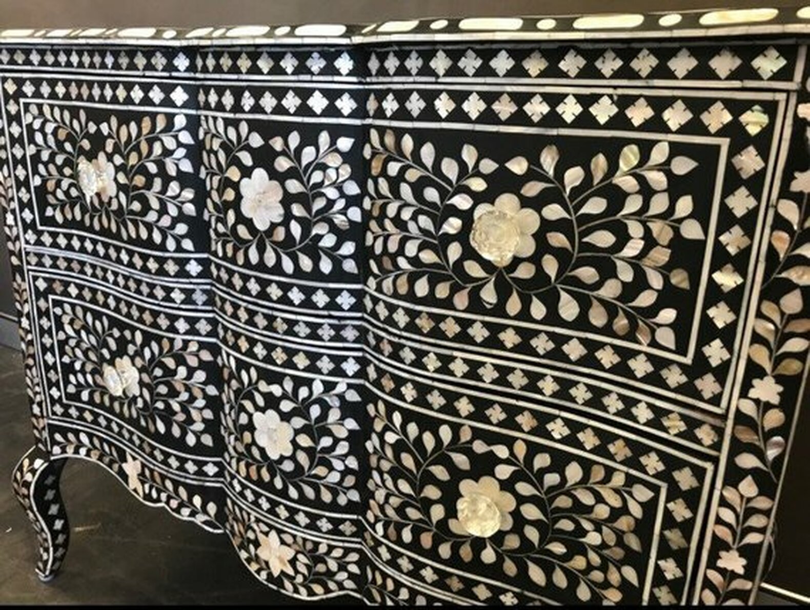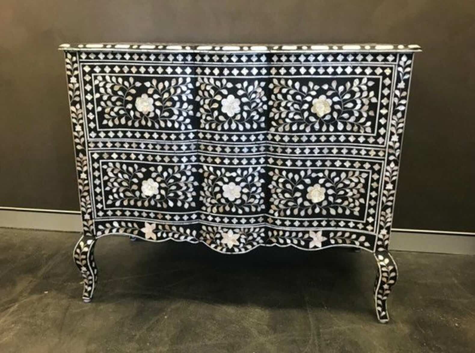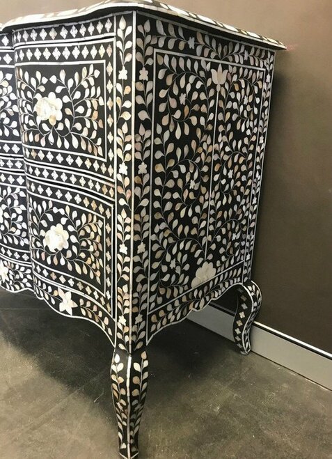 Each piece has been handcrafted in a process that can take weeks using honorably sourced Bone / Mother of Pearl. Delicately carved pieces of Bone/Mother of Pearl have been individually inlaid onto a wooden frame in an elaborate pattern. Layers of colored resin are then used to fill around the bone/mop. Finally, the backside and inside areas are painted with the matching colors.