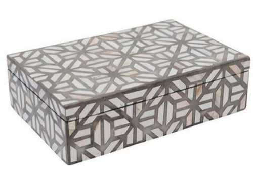 Each piece has been handcrafted in a process that can take weeks using honorably sourced Bone / Mother of Pearl. Delicately carved pieces of Bone/Mother of Pearl have been individually inlaid onto a wooden frame in an elaborate pattern. Layers of colored resin are then used to fill around the bone/mop. Finally, the backside and inside areas are painted with the matching colors.