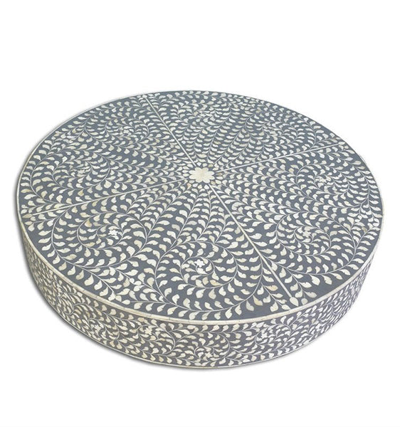 Each piece has been handcrafted in a process that can take weeks using honorably sourced Bone / Mother of Pearl. Delicately carved pieces of Bone/Mother of Pearl have been individually inlaid onto a wooden frame in an elaborate pattern. Layers of colored resin are then used to fill around the bone/mop. Finally, the backside and inside areas are painted with the matching colors.