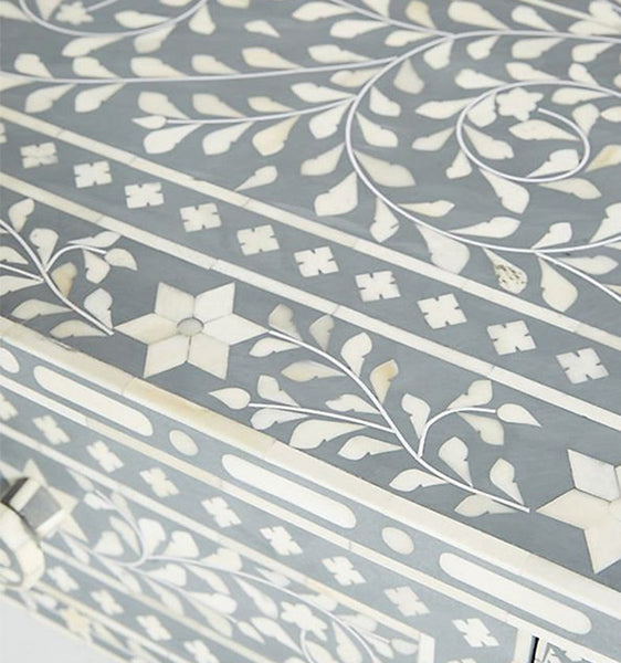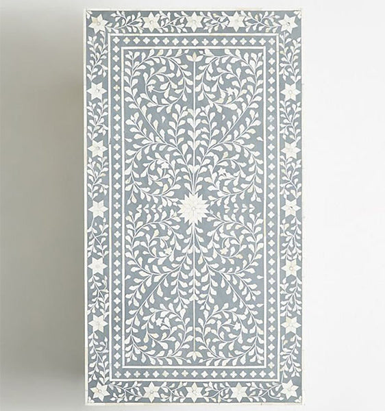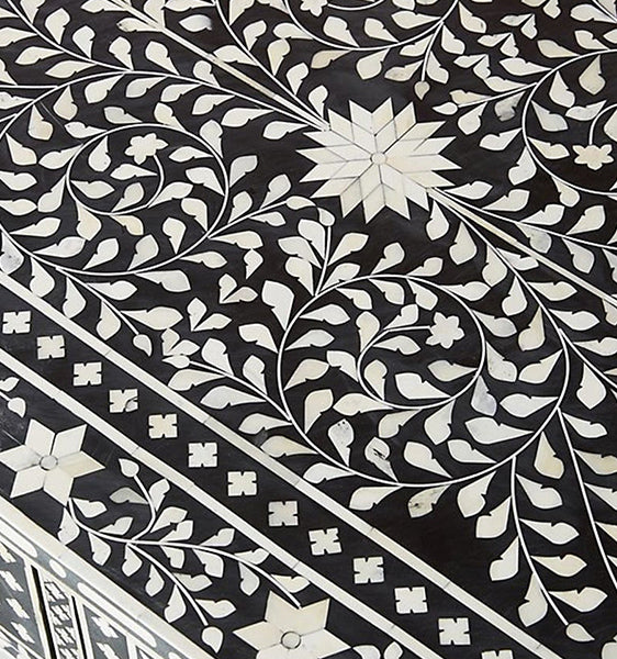 Each piece has been handcrafted in a process that can take weeks using honorably sourced Bone / Mother of Pearl. Delicately carved pieces of Bone/Mother of Pearl have been individually inlaid onto a wooden frame in an elaborate pattern. Layers of colored resin are then used to fill around the bone/mop. Finally, the backside and inside areas are painted with the matching colors.