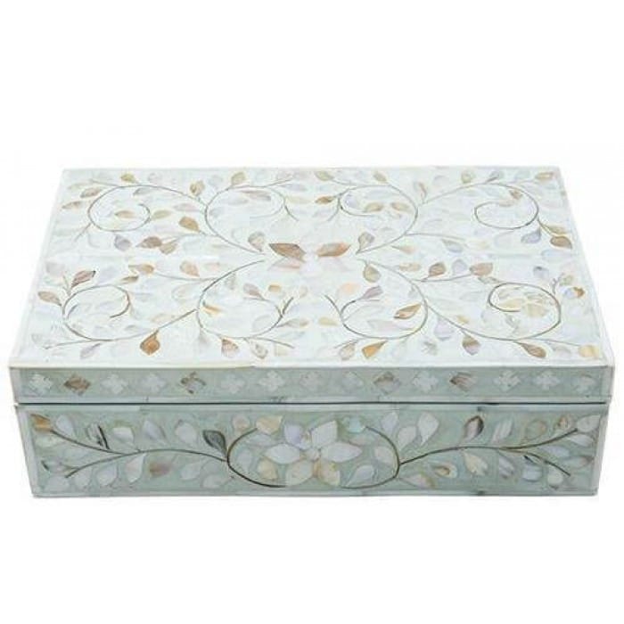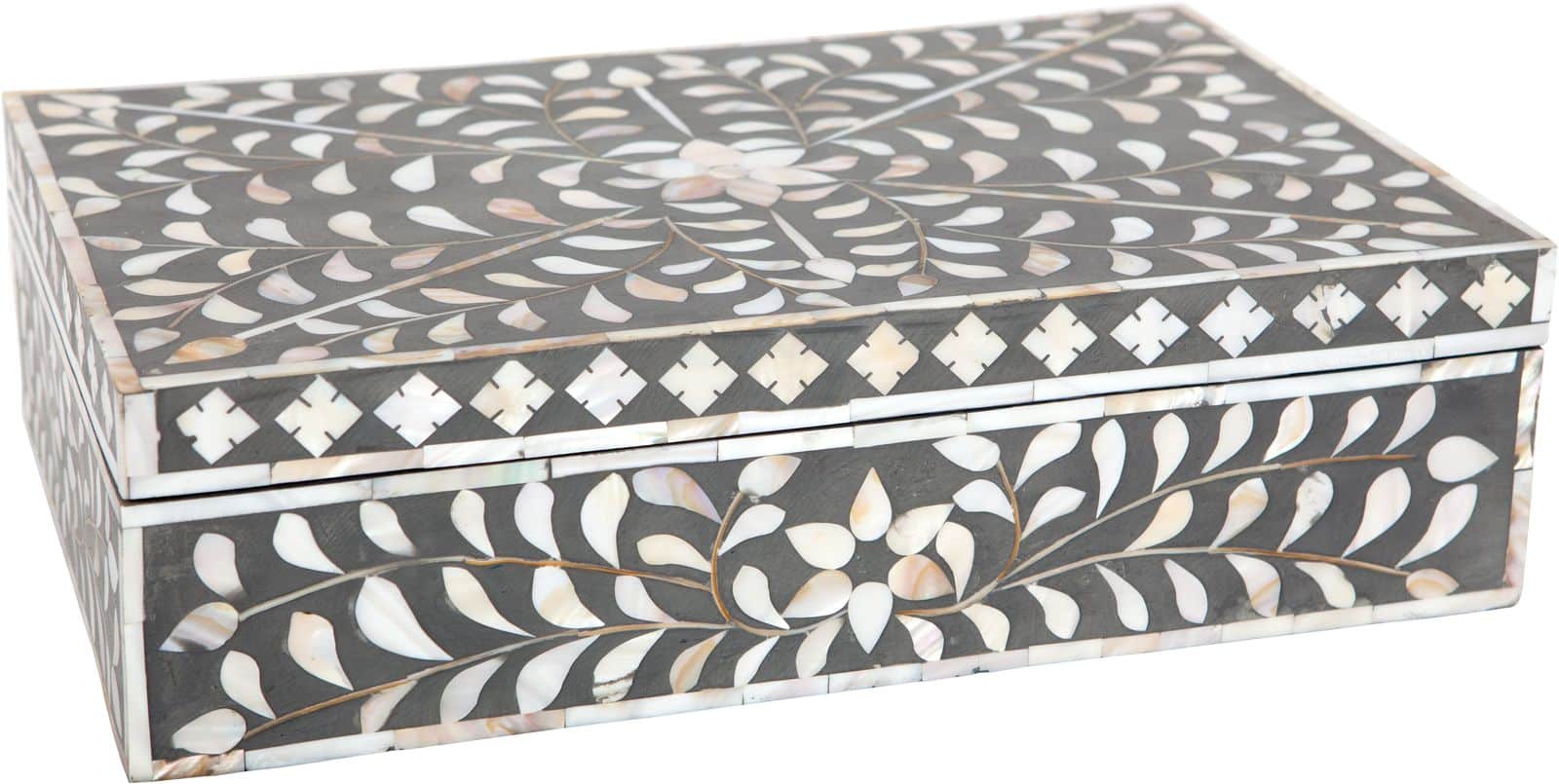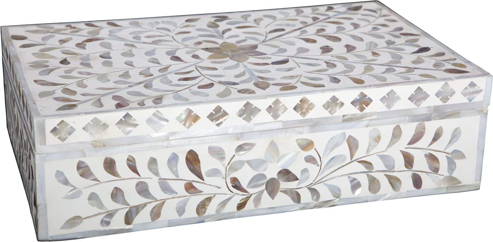 Each piece has been handcrafted in a process that can take weeks using honorably sourced Bone / Mother of Pearl. Delicately carved pieces of Bone/Mother of Pearl have been individually inlaid onto a wooden frame in an elaborate pattern. Layers of colored resin are then used to fill around the bone/mop. Finally, the backside and inside areas are painted with the matching colors.
