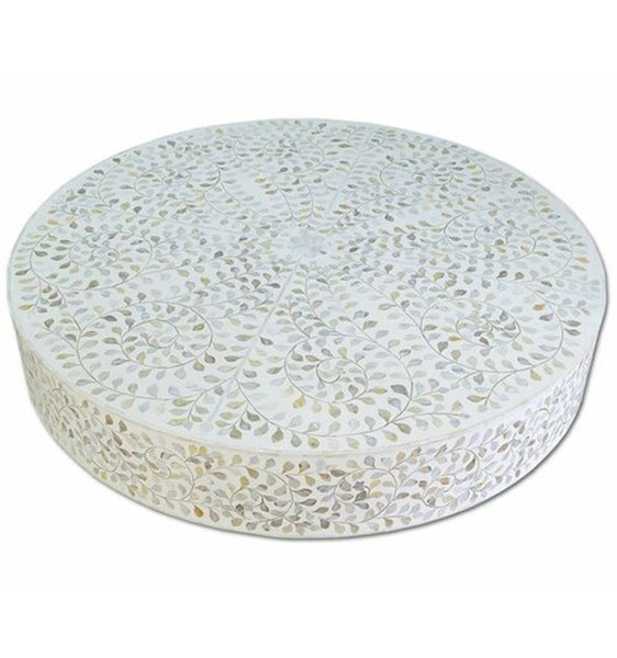 Each piece has been handcrafted in a process that can take weeks using honorably sourced Bone / Mother of Pearl. Delicately carved pieces of Bone/Mother of Pearl have been individually inlaid onto a wooden frame in an elaborate pattern. Layers of colored resin are then used to fill around the bone/mop. Finally, the backside and inside areas are painted with the matching colors.