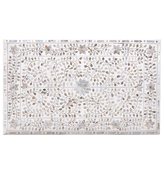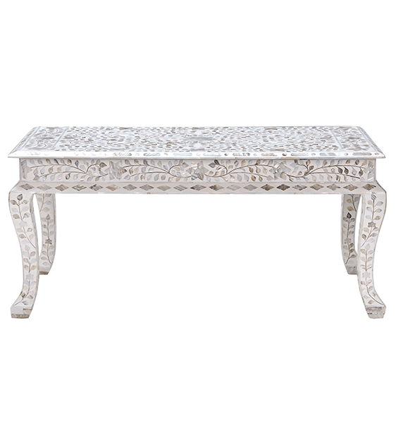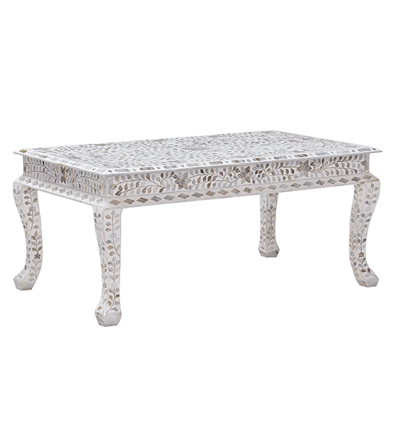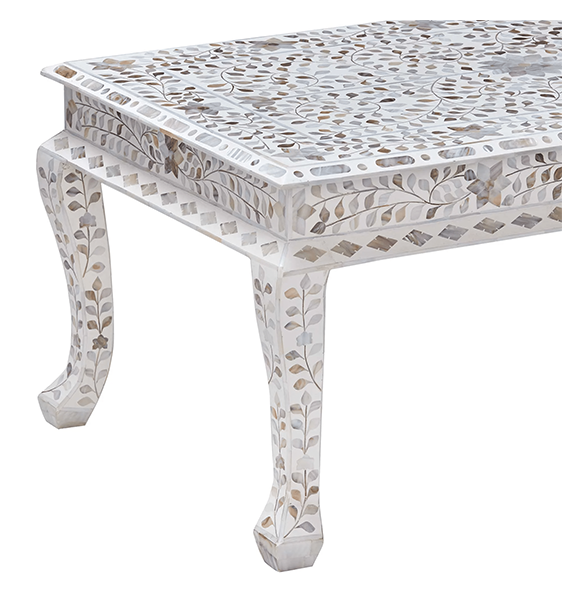 Variations in the natural product color, pattern, and shade are inherent and unique characteristics to be expected with this mother of pearl inlay coffee table. No two tables are ever exactly alike, with thousands of intricate pieces hand-laid to complete this delightful masterpiece. Each product is unique and may have different variations with anomalies due to handmade in nature.