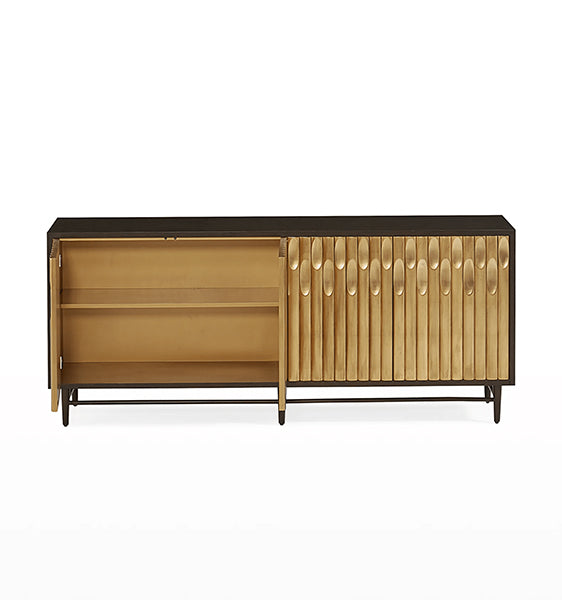 This wooden sideboard with gold finish doors is a stylish and modern addition to any home decor. The warm wooden frame complements the shimmering gold doors, creating a stunning contrast that catches the eye. The sideboard’s spacious interior includes shelves and drawers, providing ample storage space for dishes, linens, or other household items. Its sleek design is perfect for adding a touch of elegance to any room.