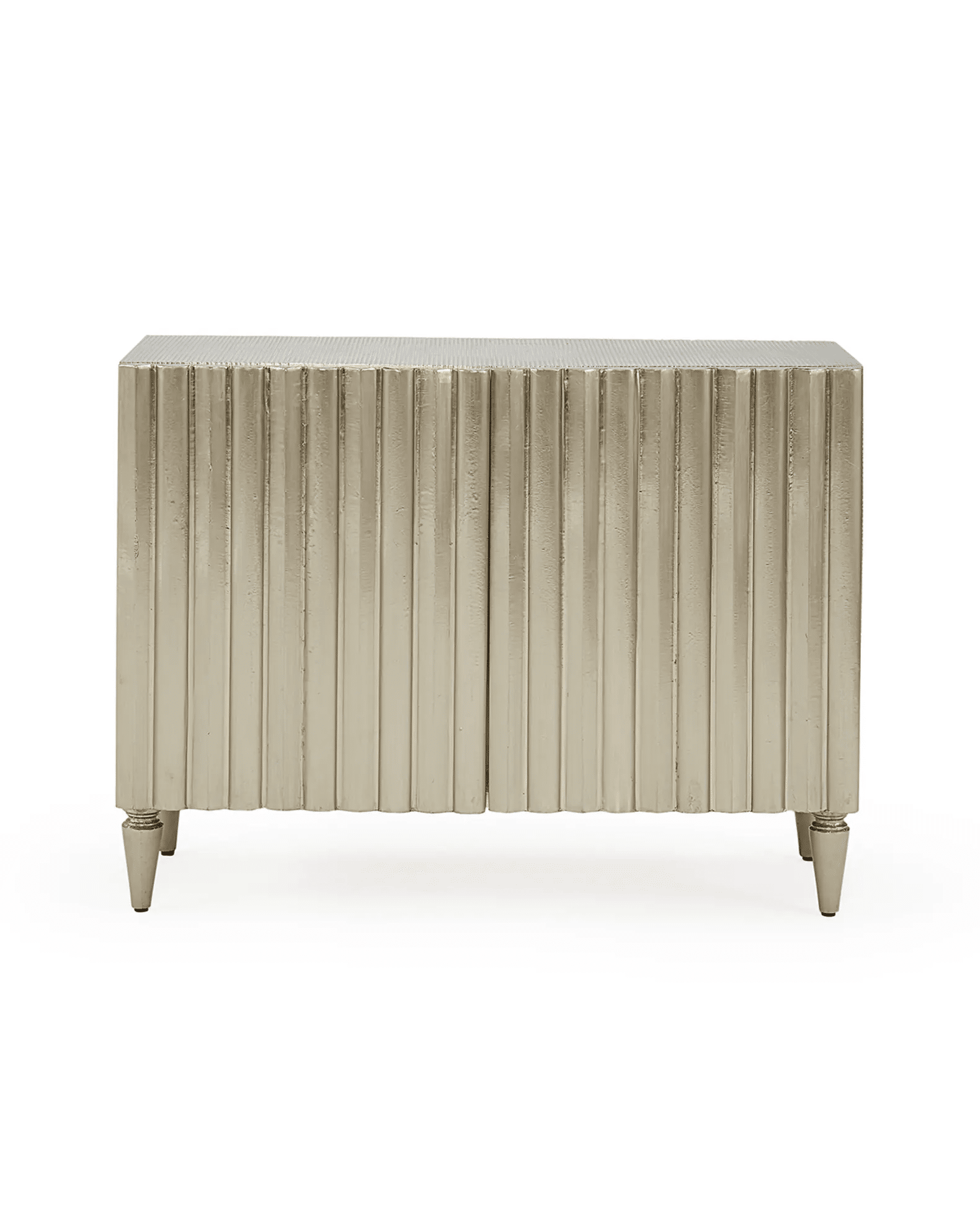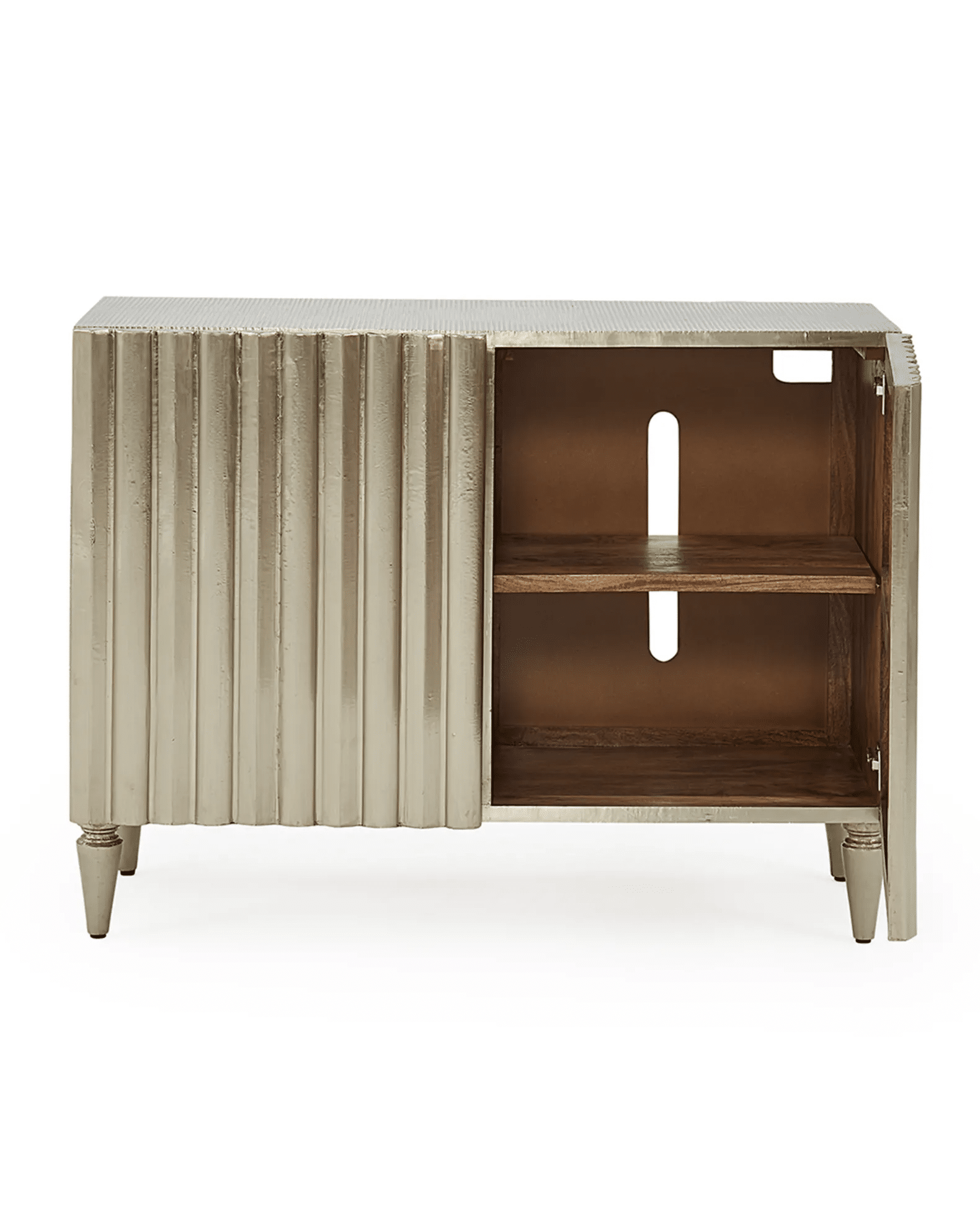 The Ritz silver cabinet is a luxurious piece of furniture that will elevate any room in your home. Its sleek silver finish catches the light beautifully, creating a stunning visual effect. The cabinet’s spacious interior includes shelves and drawers, providing ample storage space for dishes, linens, or other household items. Its elegant design is perfect for adding a touch of sophistication to any decor. A statement piece that is sure to impress.