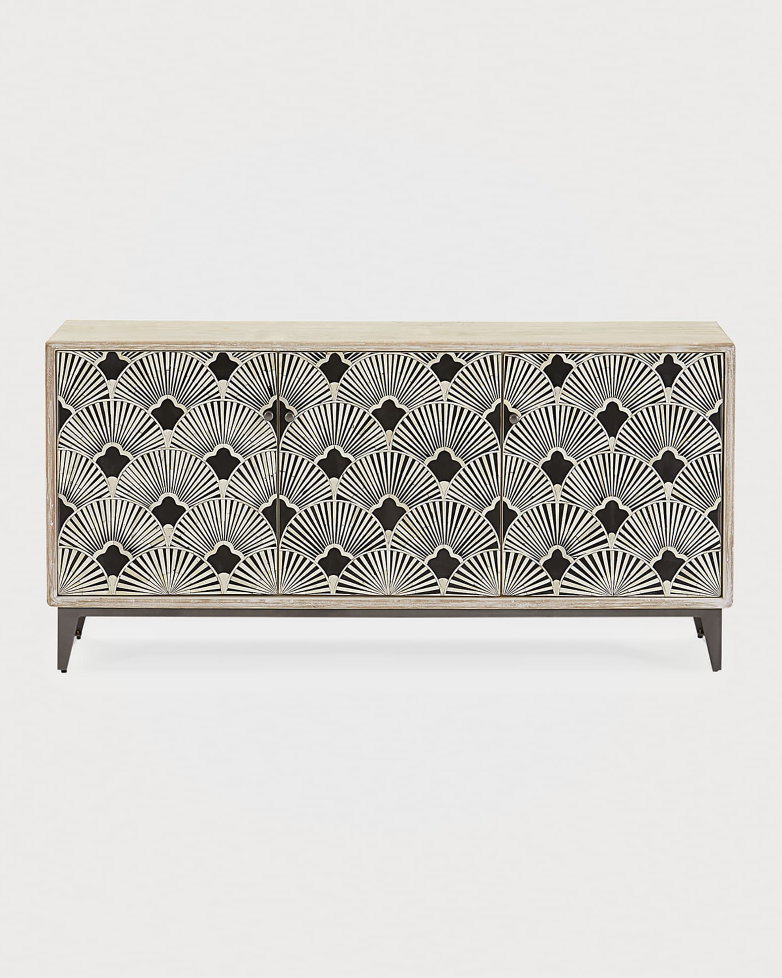 This Aura bone inlay media cabinet is a stunning piece of furniture that will add a touch of exotic flair to any room. Its intricate bone inlay design is a true work of art, while its spacious interior provides ample storage space for media equipment and accessories. A beautiful and functional addition to your home decor.