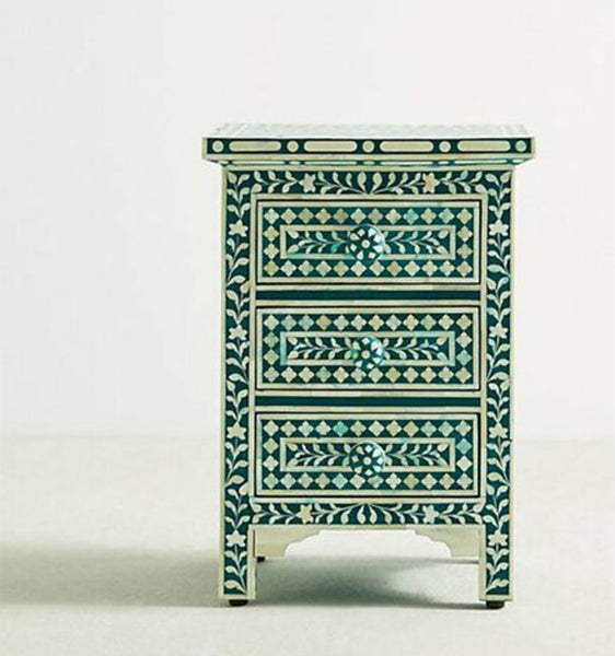 Each piece has been handcrafted in a process that can take weeks using honorably sourced Bone / Mother of Pearl. Delicately carved pieces of Bone/MoP have been individually inlaid onto a wooden frame in an elaborate pattern. Layers of colored resin are then used to fill around the bone/mop. Finally, the backside and inside areas are painted with the matching colors.