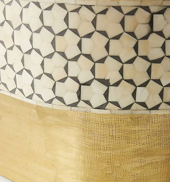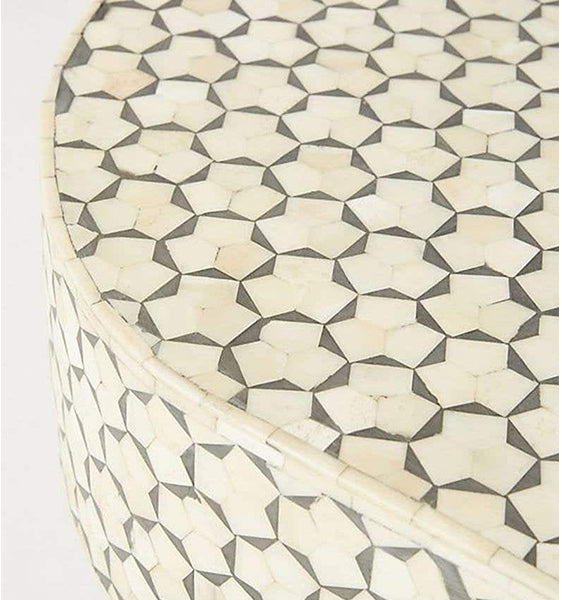 Each piece has been handcrafted in a process that can take weeks using honorably sourced Bone / Mother of Pearl. Delicately carved pieces of Bone/Mother of Pearl have been individually inlaid onto a wooden frame in an elaborate pattern. Layers of colored resin are then used to fill around the bone/mop. Finally, the backside and inside areas are painted with the matching colors.