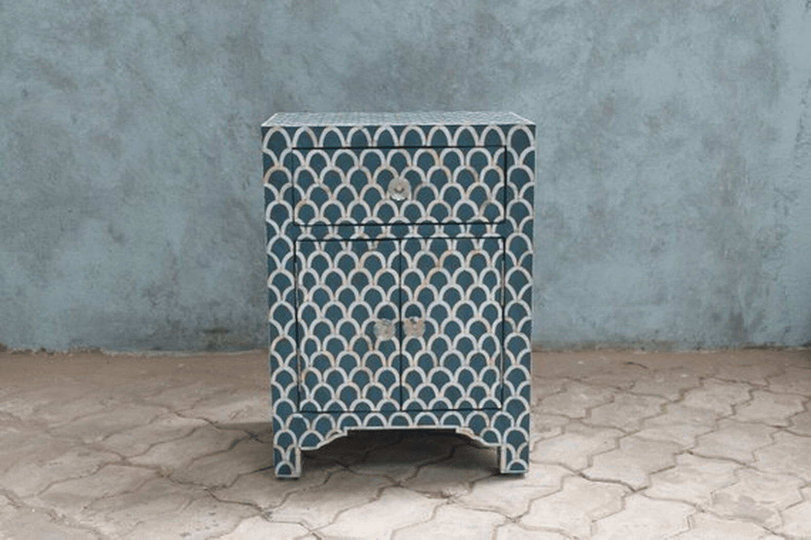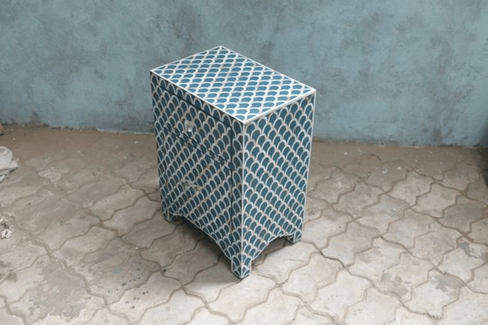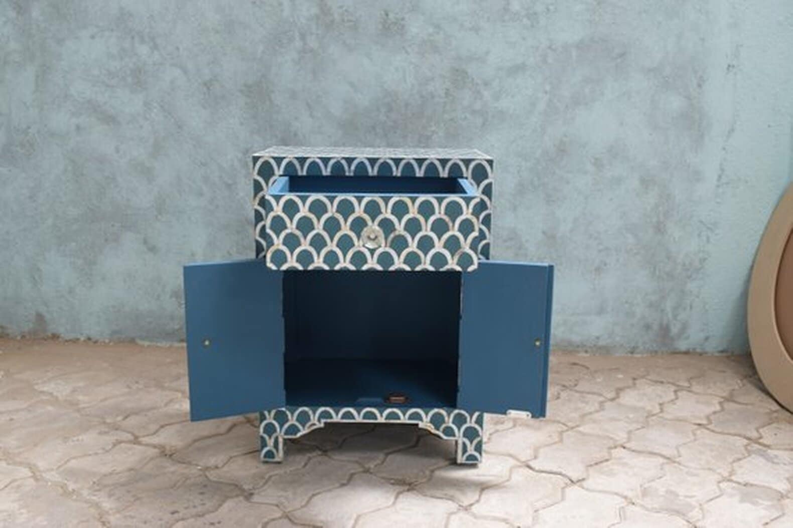 Each piece has been handcrafted in a process that can take weeks using honorably sourced Bone / Mother of Pearl. Delicately carved pieces of Bone/MoP have been individually inlaid onto a wooden frame in an elaborate pattern. Layers of colored resin are then used to fill around the bone/mop. Finally, the backside and inside areas are painted with the matching colors.