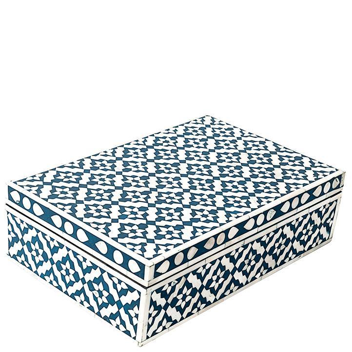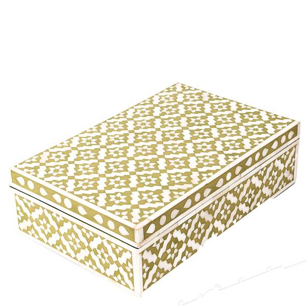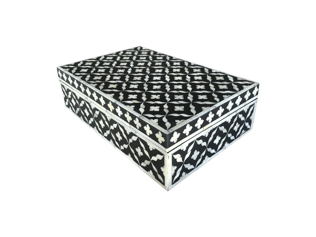 Each piece has been handcrafted in a process that can take weeks using honorably sourced Bone / Mother of Pearl. Delicately carved pieces of Bone/Mother of Pearl have been individually inlaid onto a wooden frame in an elaborate pattern. Layers of colored resin are then used to fill around the bone/mop. Finally, the backside and inside areas are painted with the matching colors.